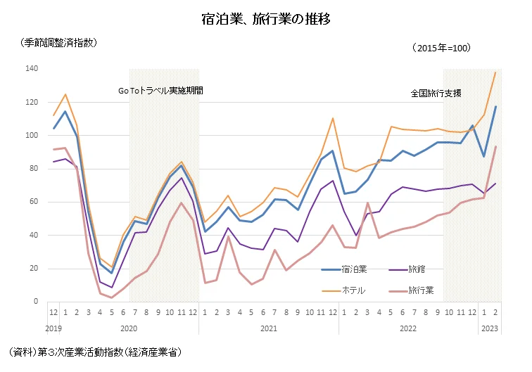 しかしコロナ禍が明けた今、旅行産業は着実に回復へと進んでいます。Go Toトラベルの実施で一度盛り上がりを取り戻した後、第3波の感染拡大期(2020年12月から2021年1月)による再度停滞を見せましたが、2022年10月に始まった全国旅行支援の効果もあり、現在ではコロナ禍前である2019年12月を2%上回る水準まで回復しています。